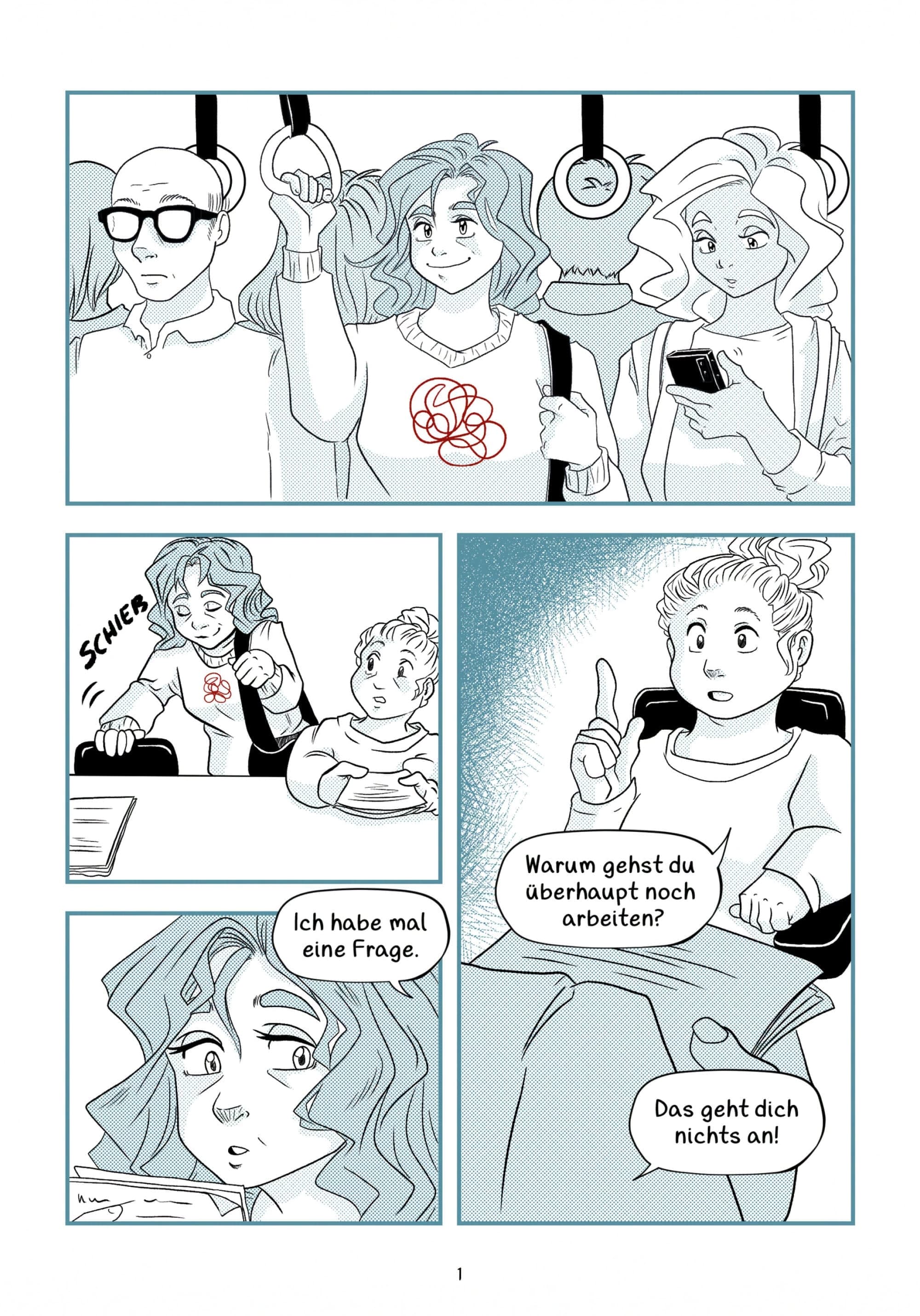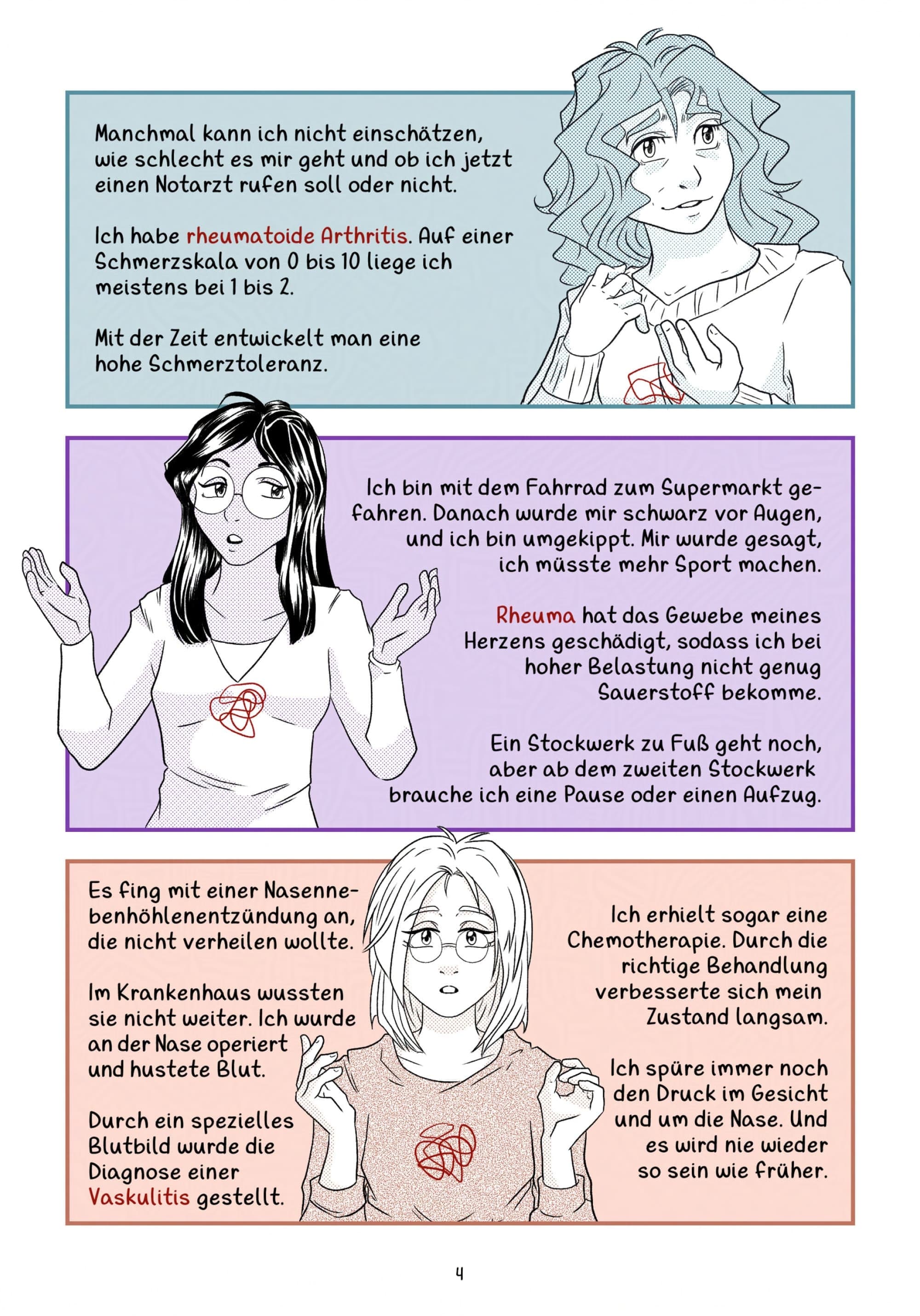 Diese sechs Seiten sind für die Akzeptanzkampagne „Comic meets Rheuma“ des Klinikum Nürnberg entstanden. Die Idee und Organisation von der Kampagne, kam von Axel Hueber, MD PhD. Comicschaffende, Rheumapatient*innen und Ärzt*innen kamen zusammen und durch den Austausch sind 20 unterschiedliche und kreative Comics zum Thema „Rheuma“ entstanden. Ich bin froh, dass ich dabei sein durfte und das, was ich an diesem Tag mitgenommen habe, durch meinen Comic präsentieren durfte.