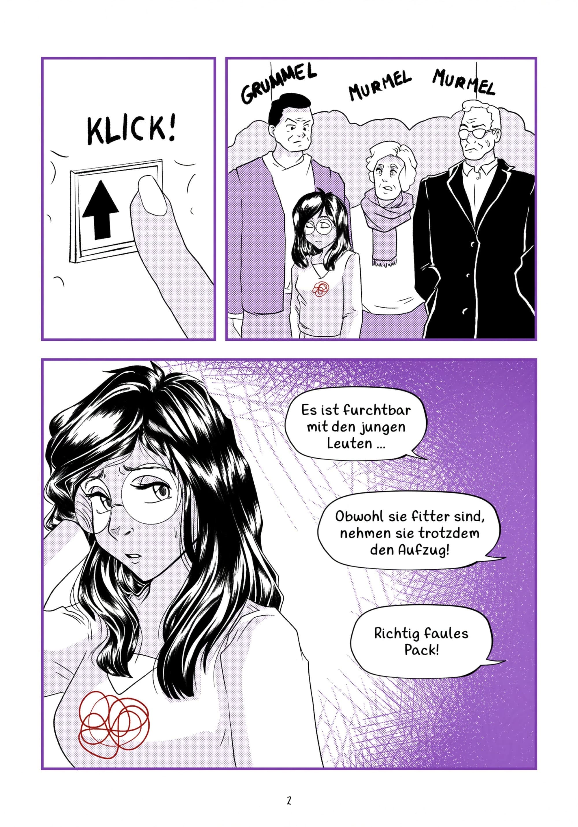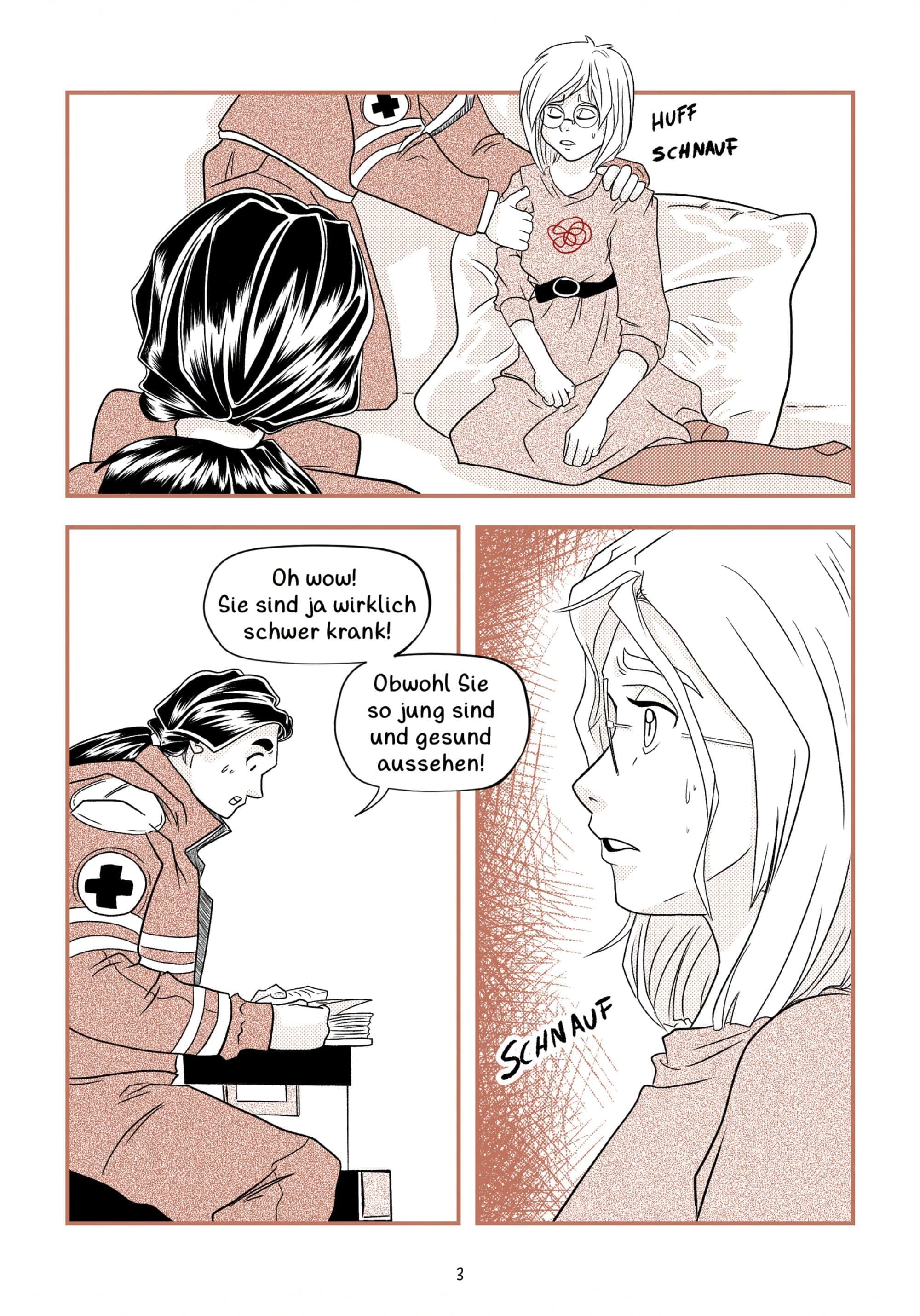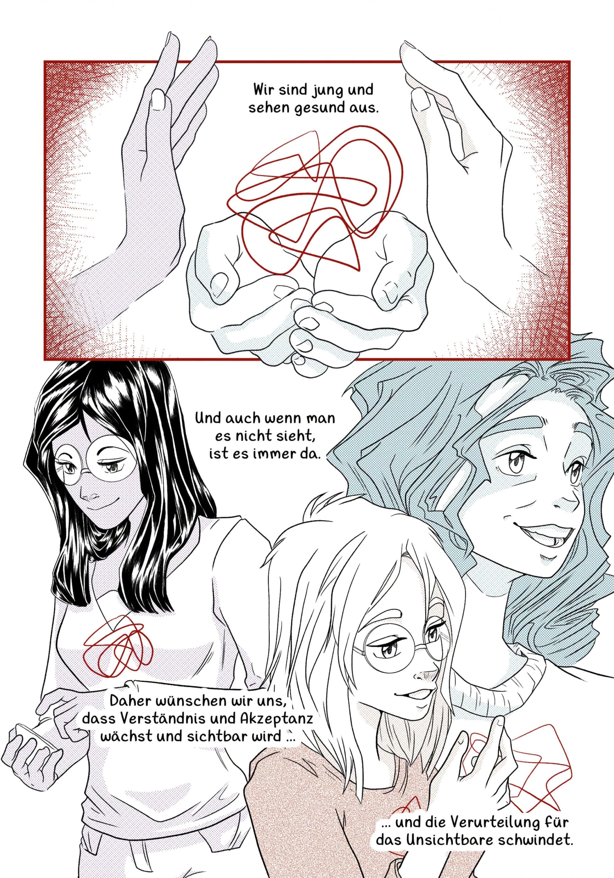 In meinem Comic liegt der Fokus auf dem Unsichtbaren, darauf, dass man chronische Krankheiten Patientinnen und Patienten nicht ansehen kann, egal welchen Alter. Ich habe mich für dieses Thema entschieden, weil die Patientinnen, mit denen ich gesprochen habe, ähnliche Erfahrungen hatten und sie im Alltag oft missverstanden werden.