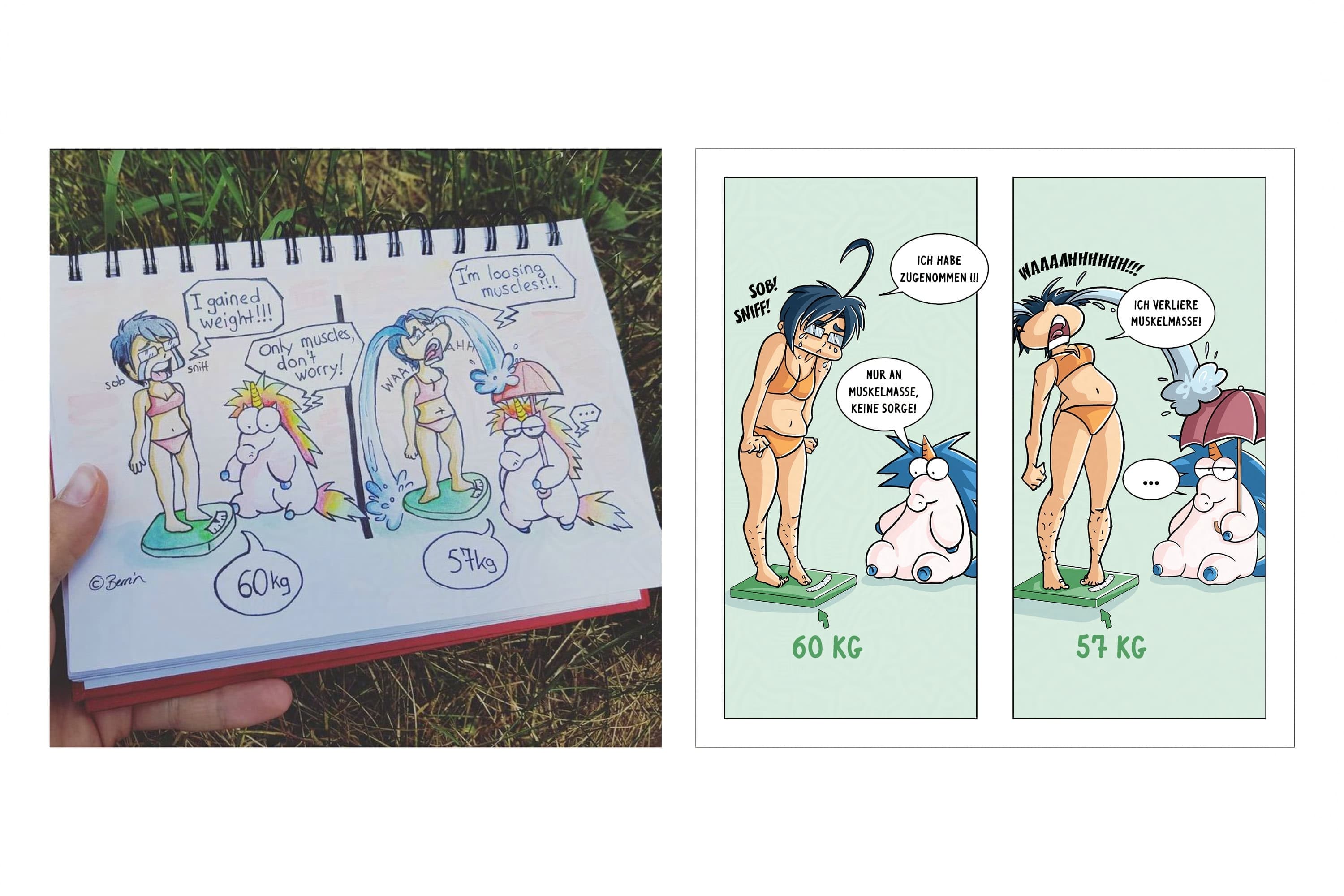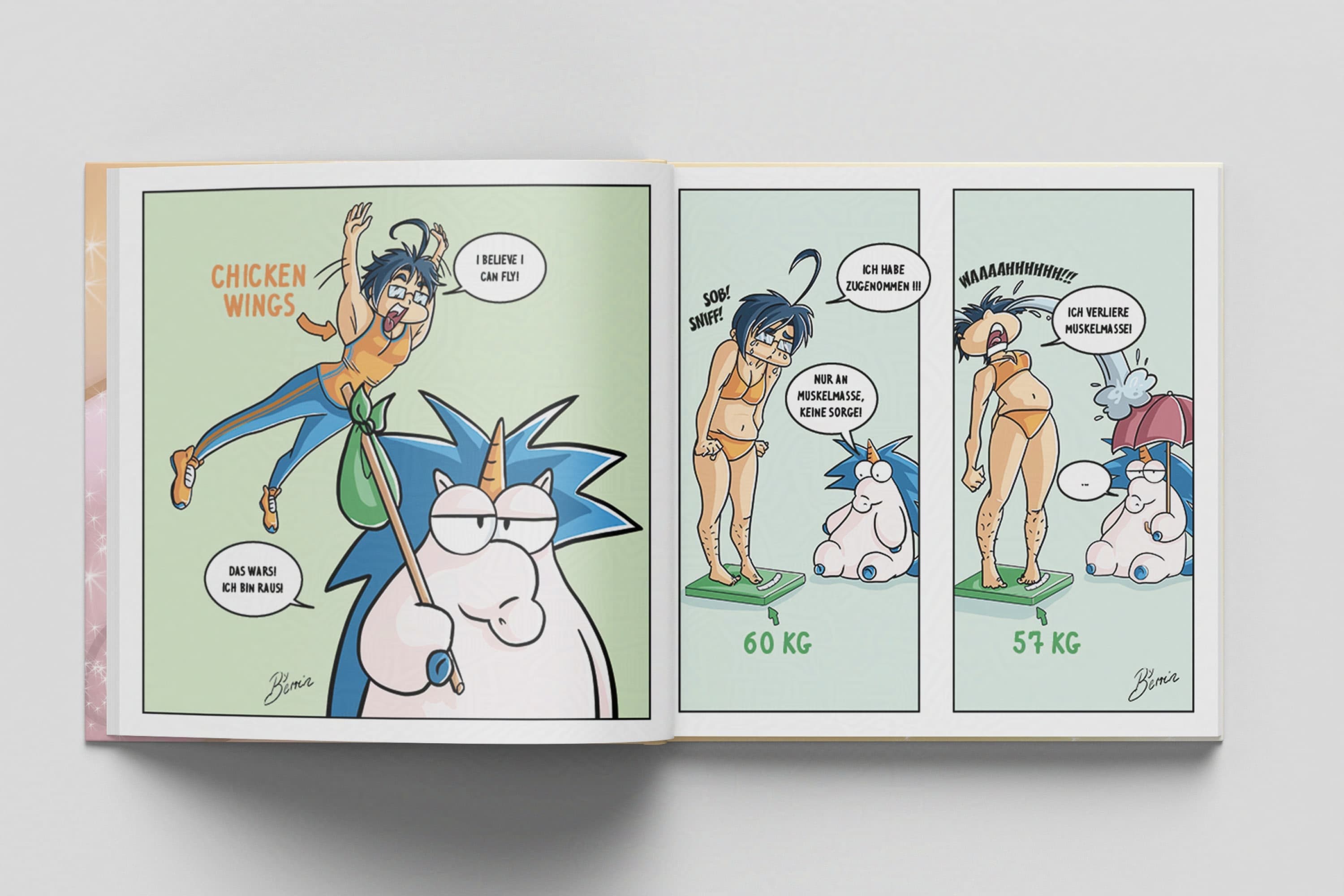 2011 hat Berrin für sich die Welt des Sports entdeckt und zudem angefangen, sich mit dem Thema Ernährung auseinanderzusetzen. Sicherlich lief am Anfang nicht alles rosig, aber einen Vorteil hatte es … durch die Erfahrungen und die Erlebnisse konnte sie es zu einem lustigen Comic verpacken.