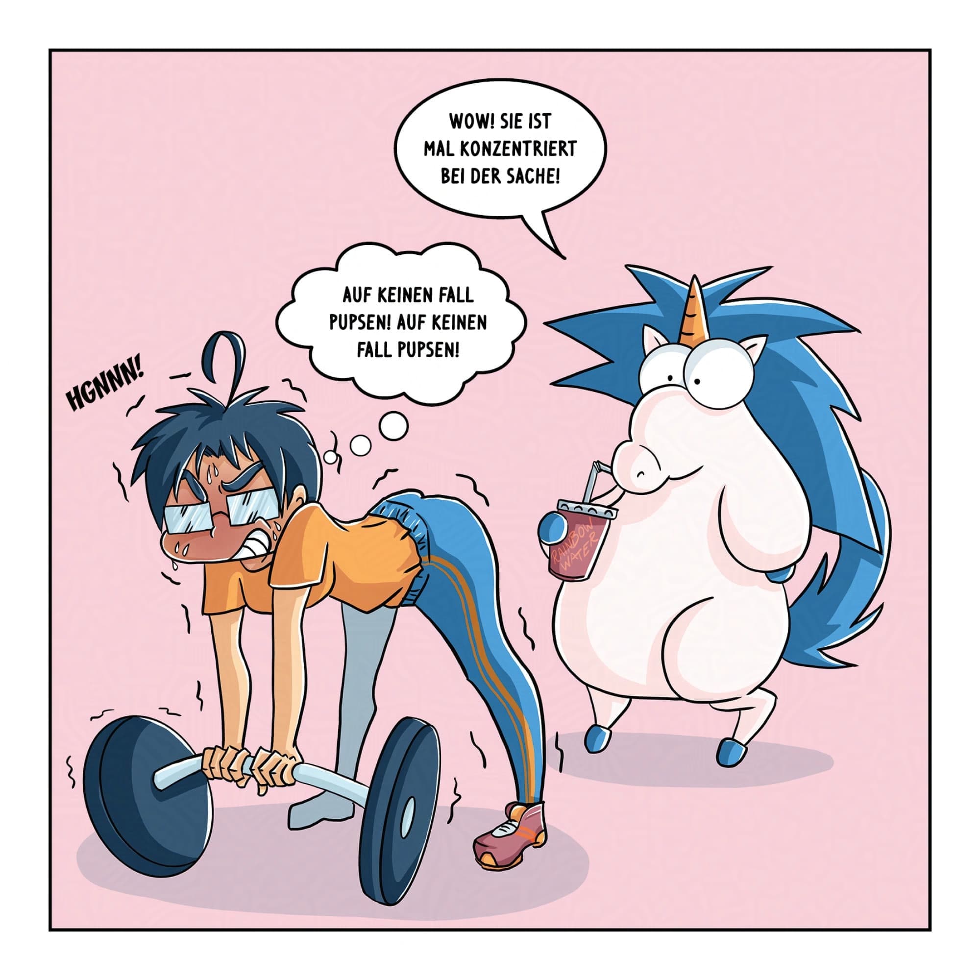 Das „Fitness Einhorn“ ist eine Geschichte über Berrins sportlichen Avatar, der sie anspornt, nervt, verhöhnt und vieles mehr.