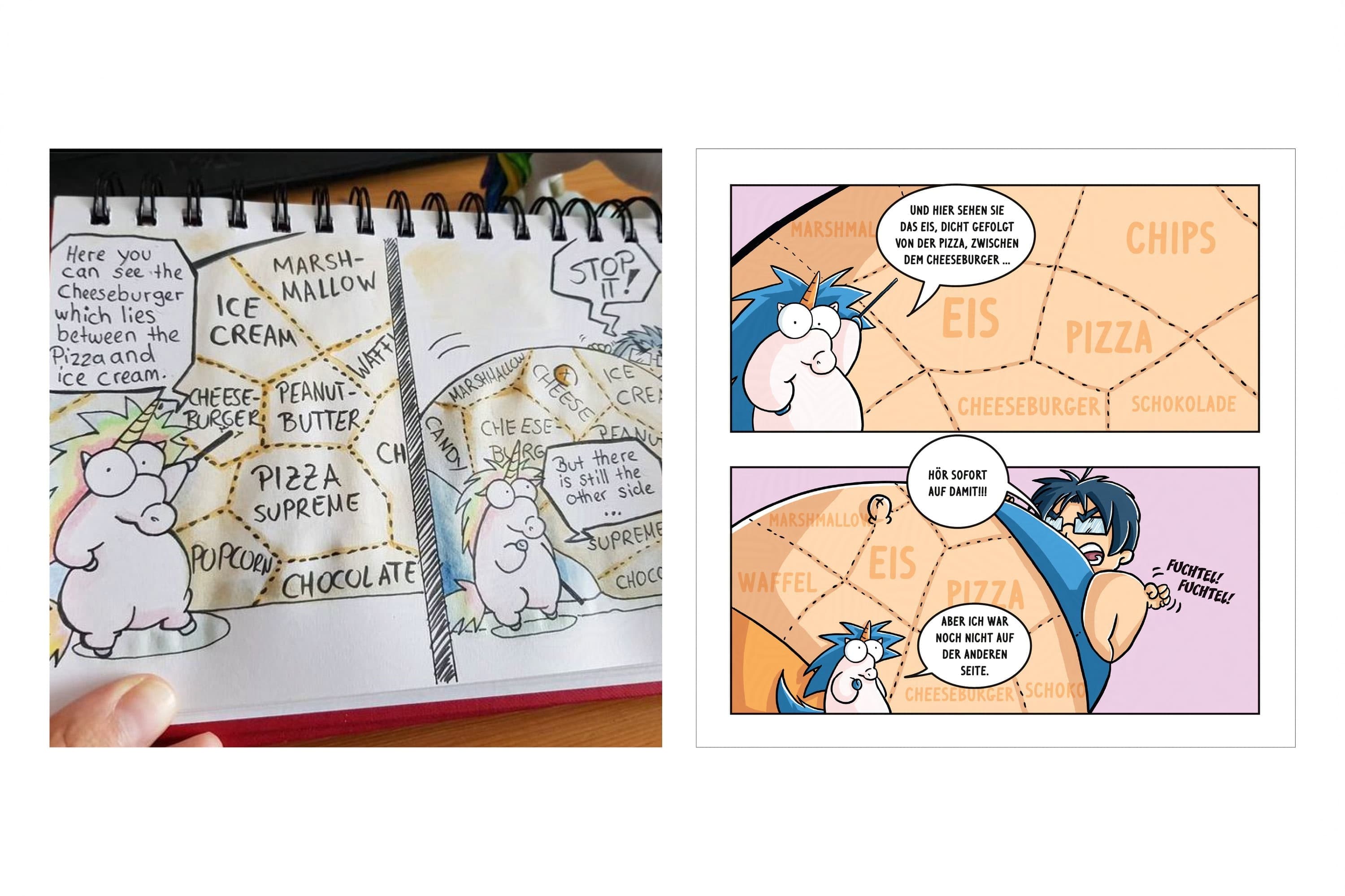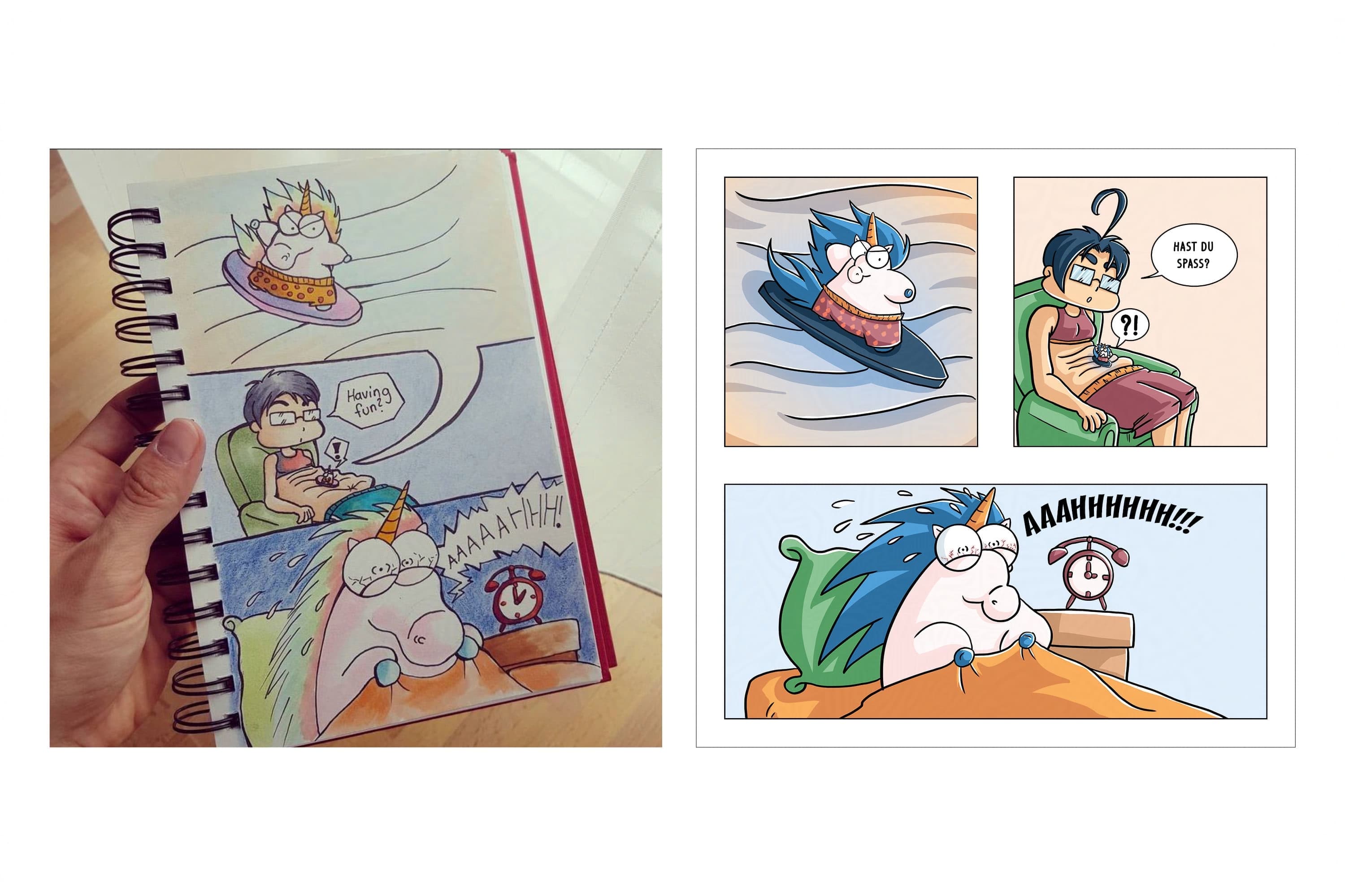 Die ersten groben Vorskizzen erstellte ich meinem Skizzenbuch vor paar Jahren. Mit Aquarel habe ich dem ganzen Farbe gegeben. Jedes mal wenn ich eine Idee zu der Geschichte hatte, habe ich es sofort in mein Buch skizziert. Ich führte es immer mit mir.