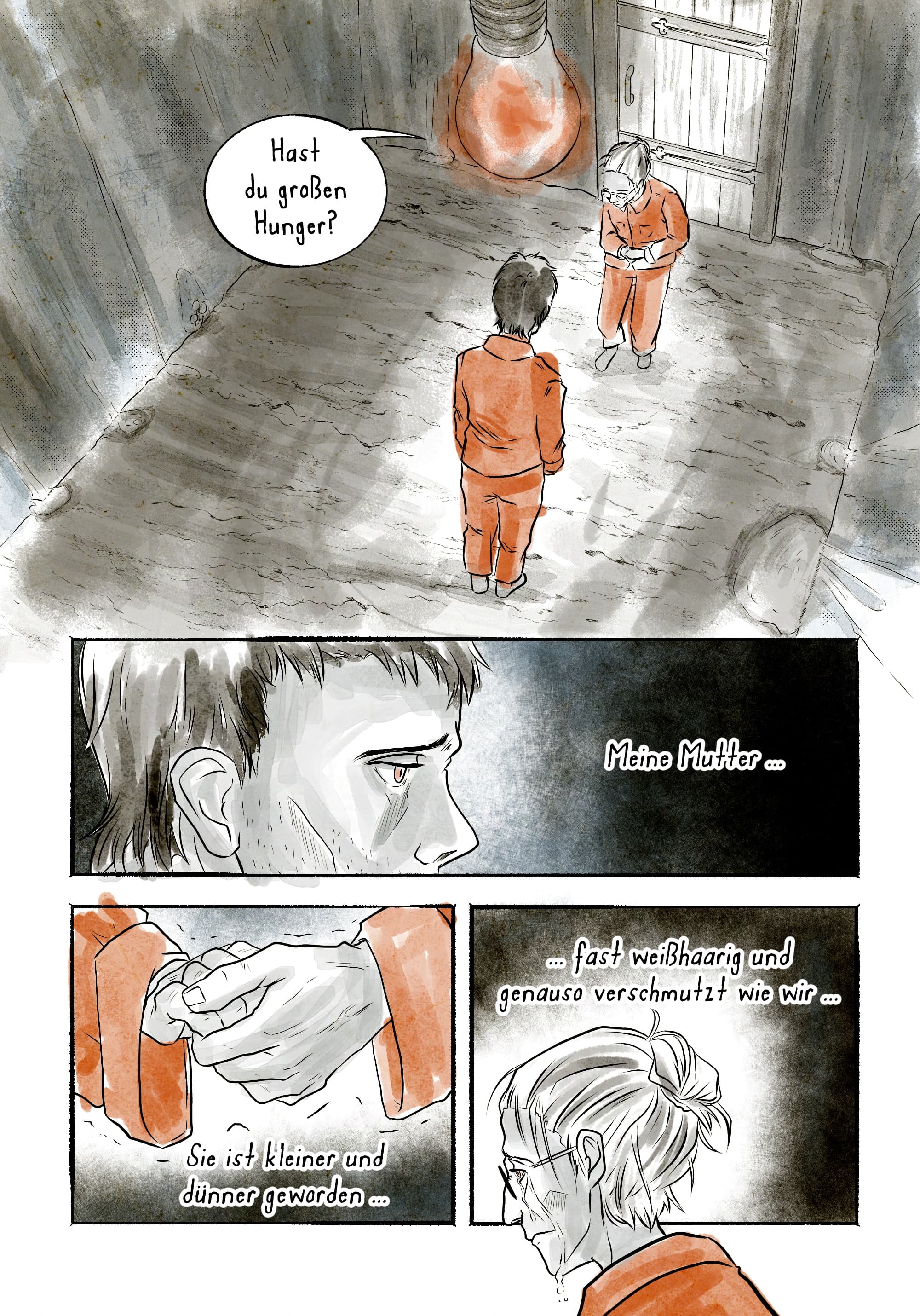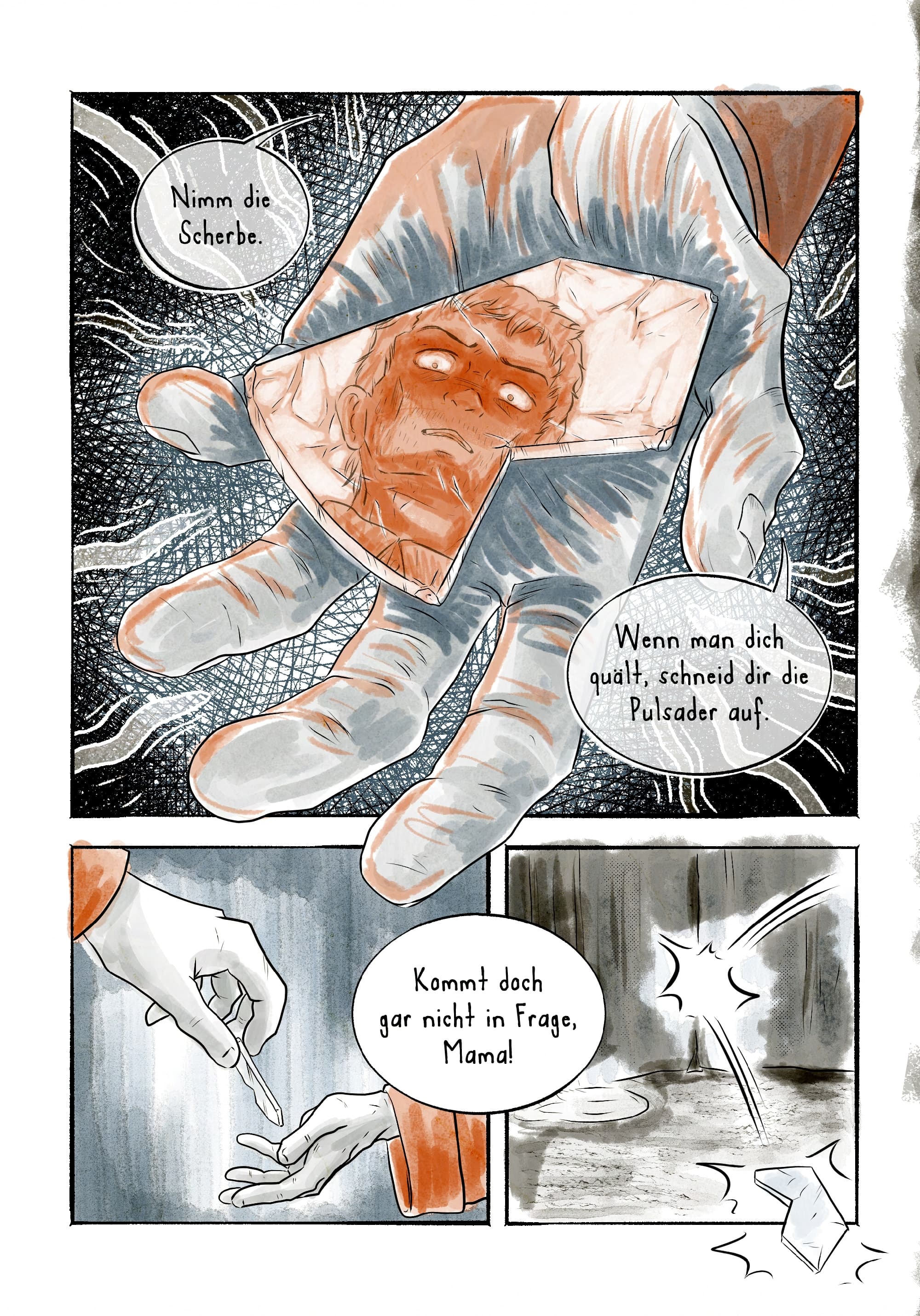 Die erste Runde bestand darin, zwei skizzierte Seiten aus dem Tagebuch von Eugen Herman-Friede einzureichen. Danach ging es von der Jury ins Auswahlverfahren und zehn Comic-Schaffende und ich schafften es in die zweite Runde. Hier war nun die Aufgabe, vier fertig illustrierte Comicseiten einzureichen. So hat die Jury eine bessere Vorstellung, wie die ganze Graphic Novel komplett umgesetzt aussehen könnte.